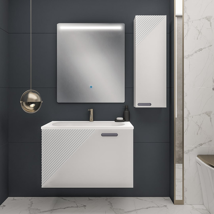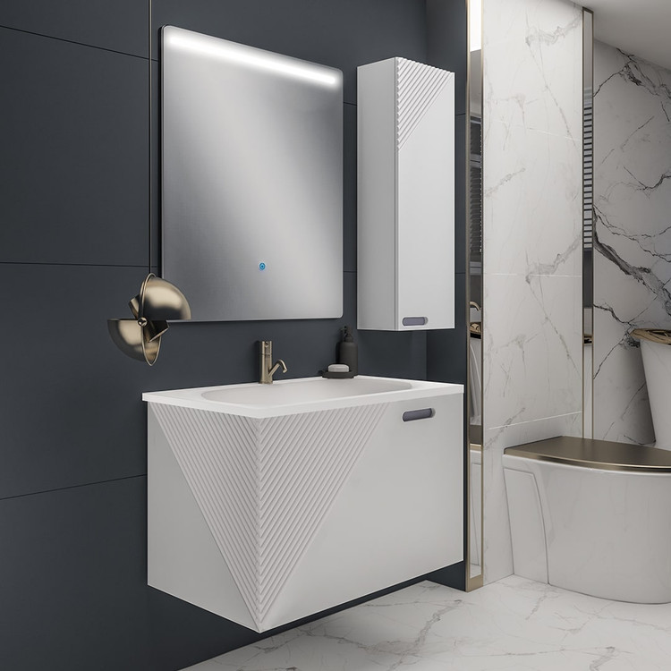 مشخصههاي بارز اين محصولات ضدآب و ضد رطوبت بودن آن هاست. يراق آلات اين محصول استيل بوده و در محيط مرطوب زنگ نمي زند.لازم به ذکر است شيرآلات قابل نصب براي اين محصول شير روشويي پایه بلند و شیر آلات توکار دیواری (سفارشی) میباشد.آینه مورد استفاده در این محصول از آینه های نسل جدید بک لایت( چراغ دار ) با تاچ لمسی جهت ایجاد روشنایی آینه و زیبایی بخشیدن به محیط سرویس بهداشتی می باشد . آینه Back Light تلفیقی از نور و آینه میباشدکه باعث زیبایی ست روشویی میشود.آینه در دو نوع لمسی و درجه دار (نمایش دمای محیط و زمان) قابل سفارش میباشد.کابینت این ست دارای یک عدد کمد که به صورت داشبوردی باز و بسته می شود.